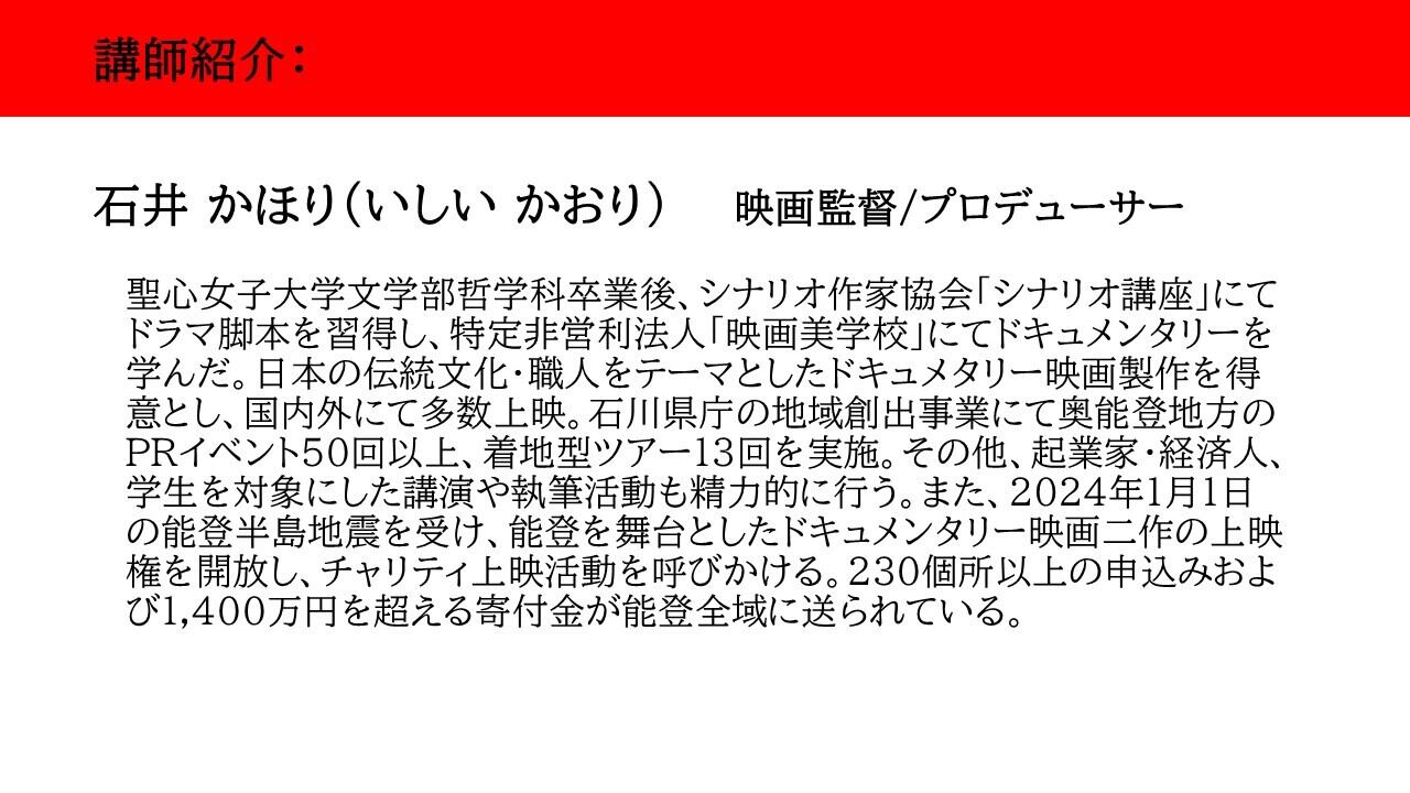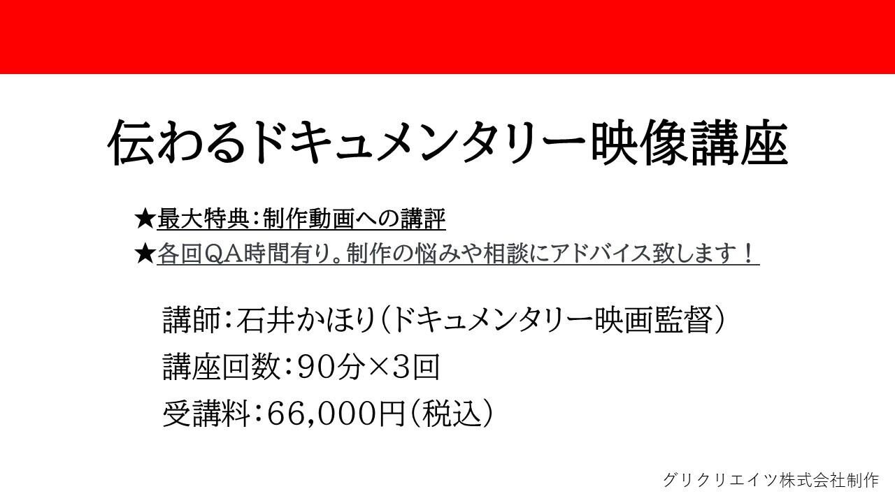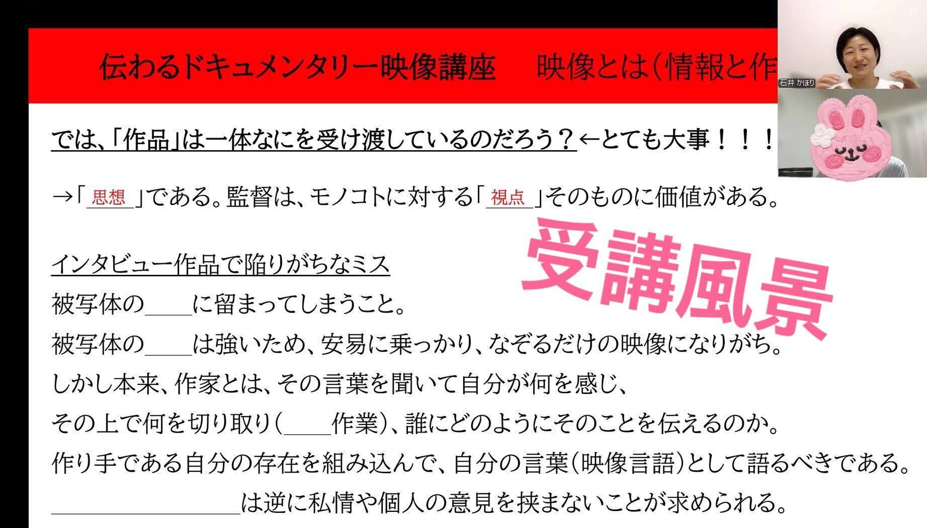 ドキュメンタリー映画監督として国内外の映画祭上映や受賞歴を持つ石井かほり氏が講師となり「伝わる映像作品」について教えるオンライン講座(全3回 & 作品アドバイス付き)。「PR映像」や「情報」ではなく、〝作品〟を手掛けたい人向けです。撮影機材や編集ソフトの使い方といった小手先の〝作り方〟ではなく、被写体との向き合い方、声の聴き出し方、人の心に響かせるとは、という〝メッセージを届ける本質〟に迫ります。キャリア20年の中で石井監督が築き上げた知識と技術は、映像作家を志す人にとって“一生モノ”となる知的財産になること間違いなしです。