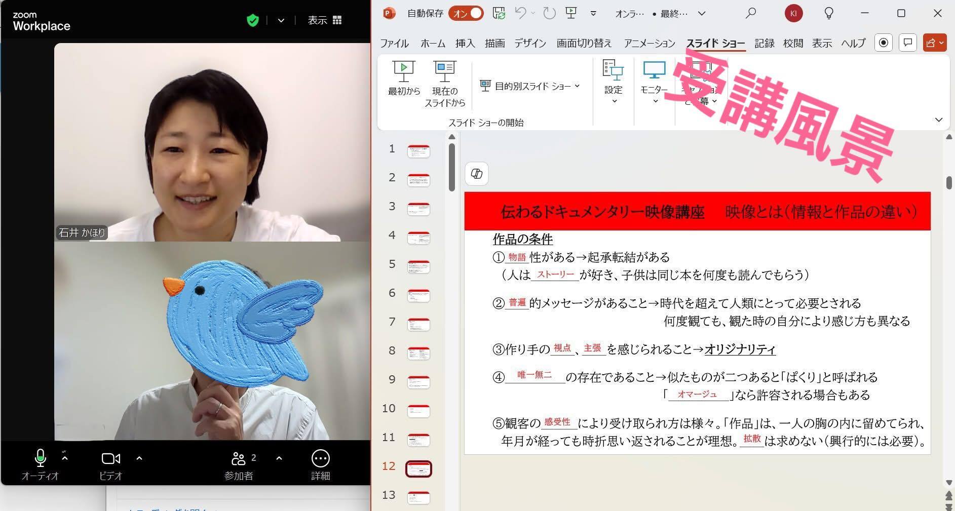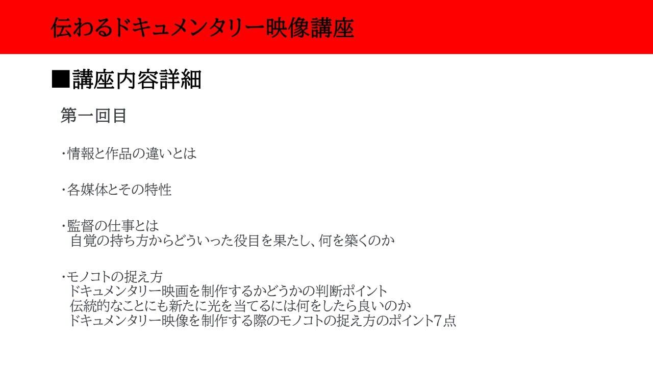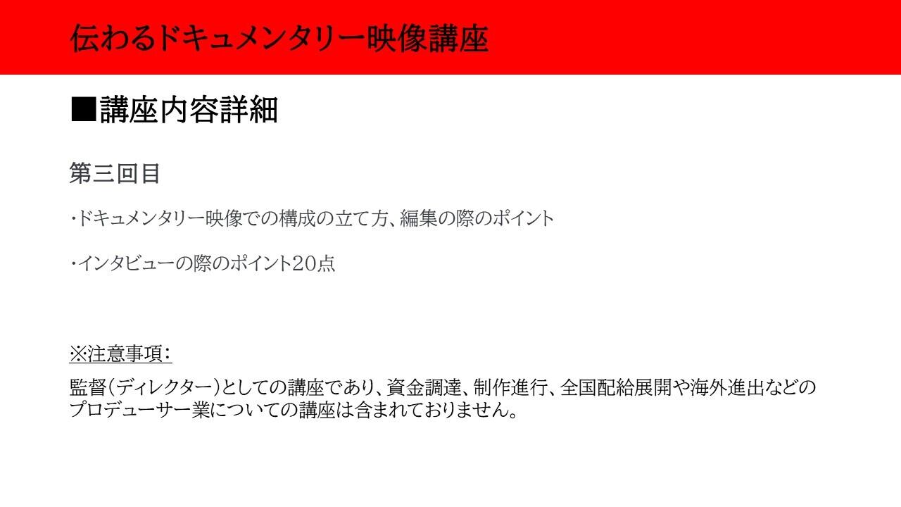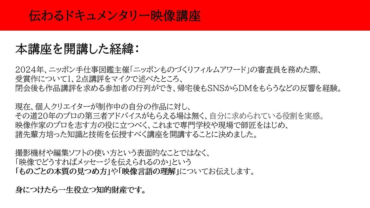 ドキュメンタリー映画監督として国内外の映画祭上映や受賞歴を持つ石井かほり氏が講師となり「伝わる映像作品」について教えるオンライン講座(全3回 & 作品アドバイス付き)。「PR映像」や「情報」ではなく、〝作品〟を手掛けたい人向けです。撮影機材や編集ソフトの使い方といった小手先の〝作り方〟ではなく、被写体との向き合い方、声の聴き出し方、人の心に響かせるとは、という〝メッセージを届ける本質〟に迫ります。キャリア20年の中で石井監督が築き上げた知識と技術は、映像作家を志す人にとって“一生モノ”となる知的財産になること間違いなしです。