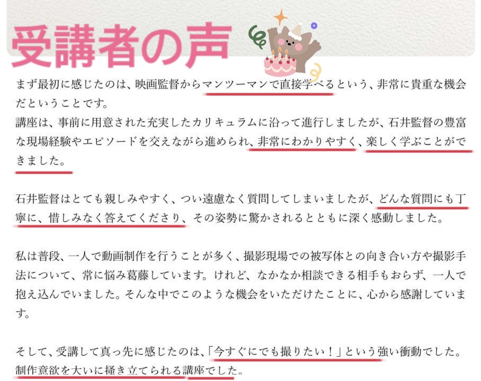 ★最大特典: 受講者の制作動画への講評(3回迄・作品数不問(総時間270分迄)・受講時間外対応可)